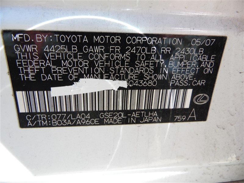 2007 LEXUS IS250 PREMIUM WHITE 2.5 AT RWD Z214562007 LEXUS IS250 PREMIUM WHITE 2.5 AT RWD Z21456